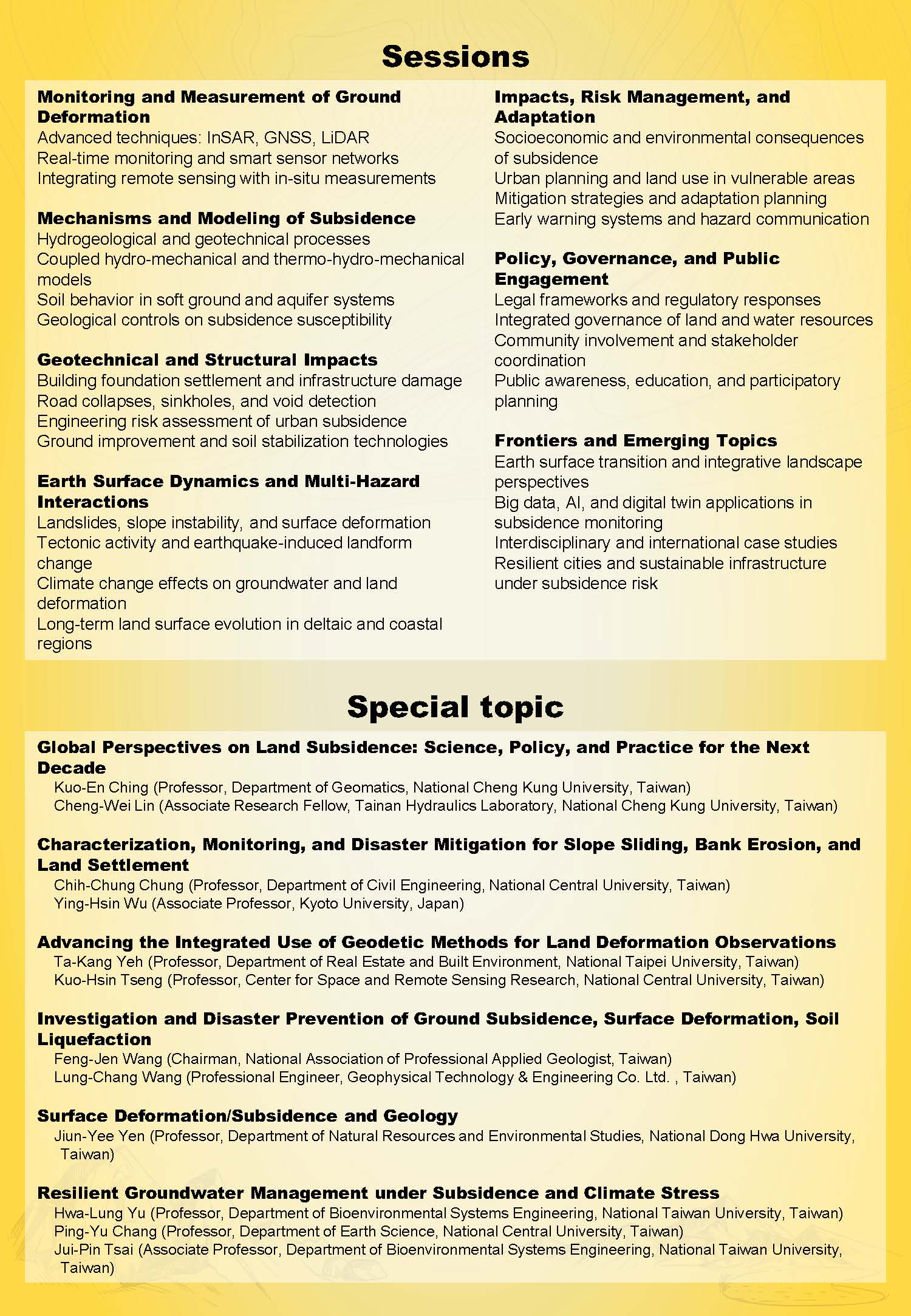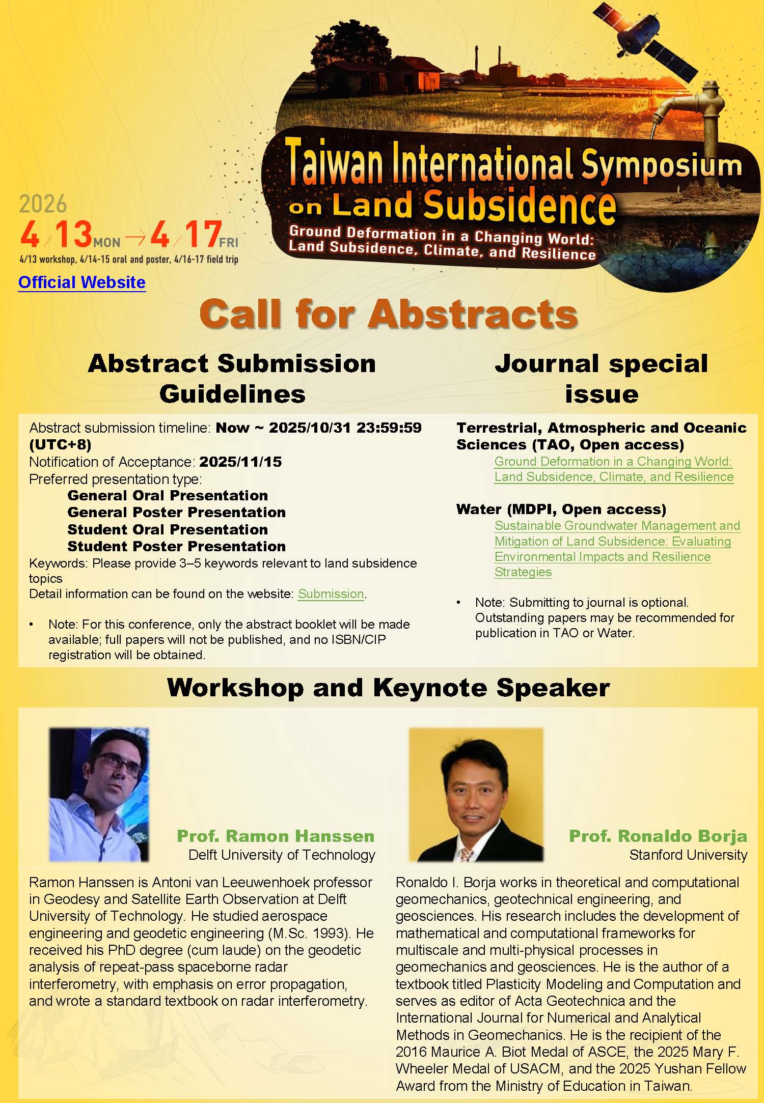 本研討會徵稿中,摘要投稿期限為2025年10月31日止,議題包含:1) Monitoring and Measurement of Ground Deformation, 2) Mechanisms and Modeling of Subsidence, 3) Geotechnical and Structural Impacts, 4) Earth Surface Dynamics and Multi-Hazard Interactions, 5) Impacts, Risk Management, and Adaptation, 6) Policy, Governance, and Public Engagement, 7) Frontiers and Emerging Topics, 8) Special topics。邀請大家踴躍投稿並參與本會議。