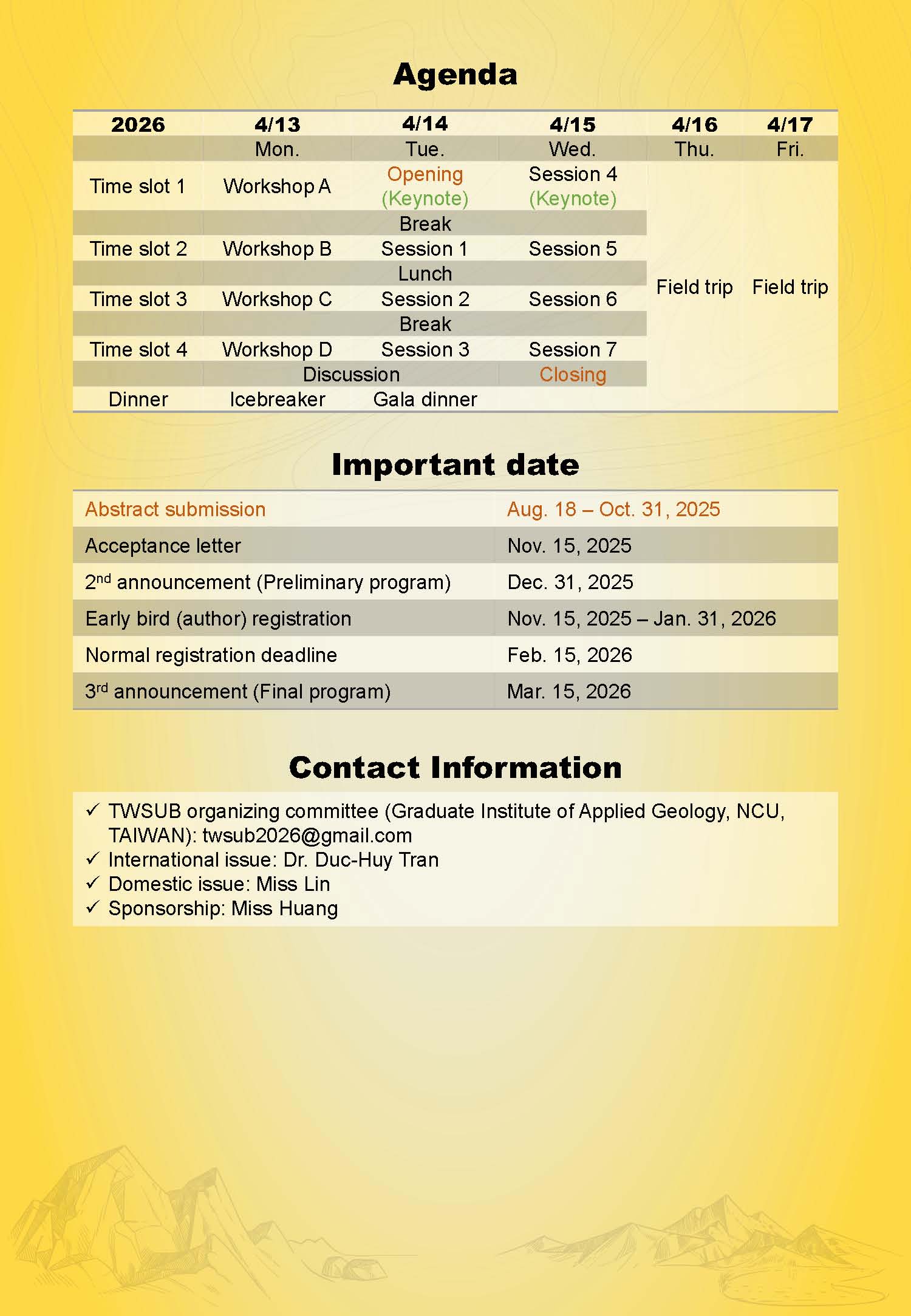 2026台灣國際地層下陷會議相關內容可於徵稿通知中詳閱。若有會議相關問題可與王士榮副教授聯繫(03-422-7151 #65870; twsub2026@gmail.com);若有贊助或廣告意願,亦可直接與黃小姐聯繫(03-422-7151 #65851),本研討會提供摘要集與手冊內頁廣告、會場內簡報輪播,以及限量廠商展覽攤位等方案。
