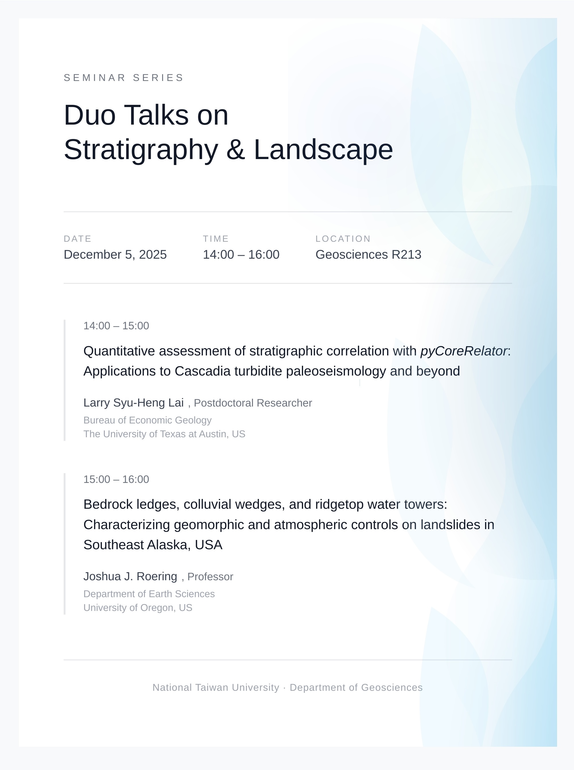 臺灣大學地質科學系林立虹教授很榮幸邀請到兩位在地形與地層研究領域具有卓越貢獻並致力於發展新技術的兩位學者——University of Oregon 的 Josh Roering 教授與 UT Austin 的賴序衡博士——將於 12 月 5 日(星期五)下午於臺灣大學地質科學系進行專題演講。 相關資訊如下,歡迎各位師生踴躍參與!