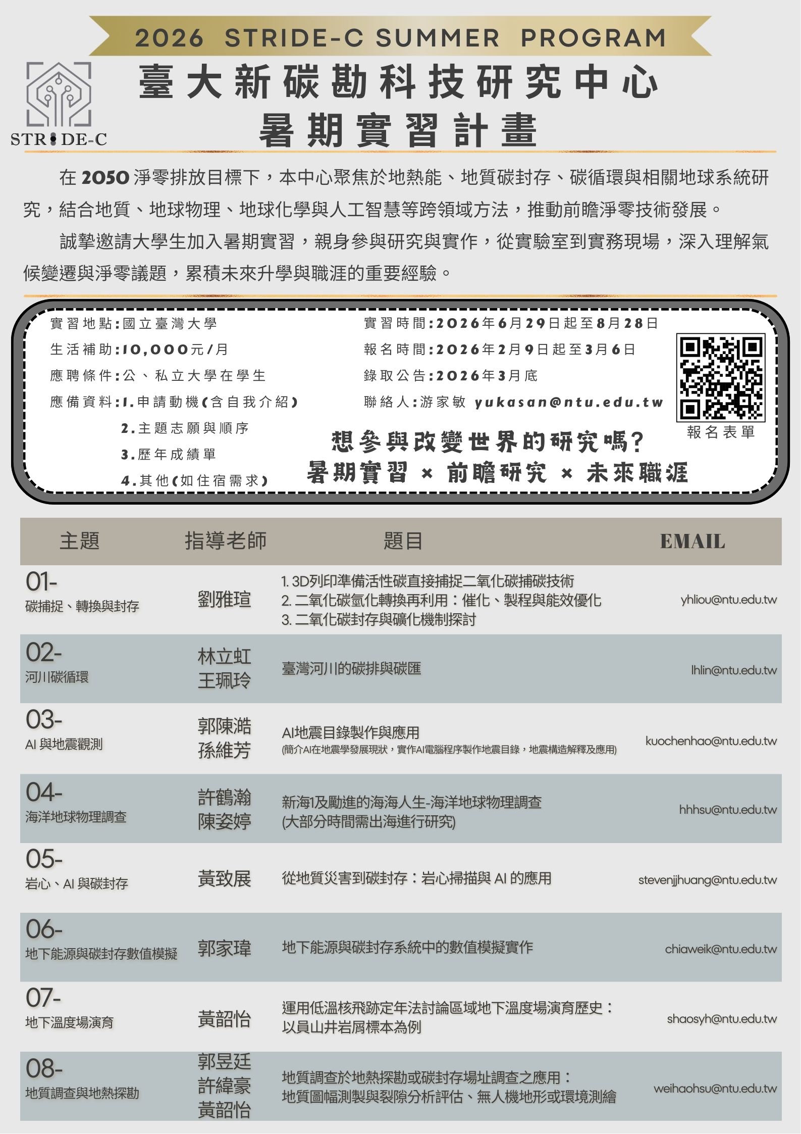 臺大新碳勘科技研究中心 2026 暑期實習計畫 開放報名囉!